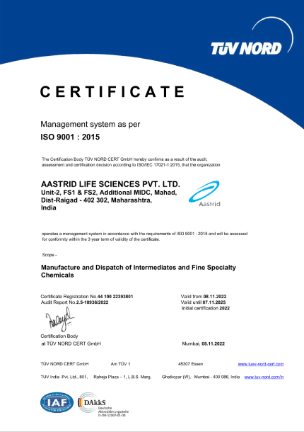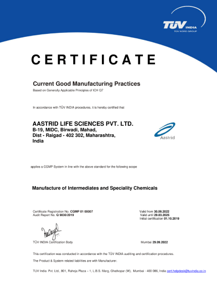 Our well-qualified and experienced operations team at Aastrid Life Sciences serves as the backbone of our operations. Every member of our operations team possesses a strong educational background and has undergone rigorous training to ensure their expertise and experience in the field. Each member brings a wealth of experience from diverse backgrounds, including chemical engineering, pharmaceutical sciences, and process optimisation. Aastrid Life Sciences adheres to quality control protocols to ensure every product meets or exceeds industry standards. Our Greenfield factory at Mahad has been awarded ISO 9001:2015 and Current Good Practices by TUV, India, within 9 months of being commissioned for operational excellence. These certificates are a result of state-of-the-art infrastructure, a well-trained team and robust procedures.