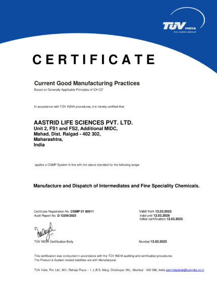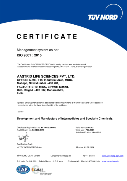 Our well-qualified and experienced operations team at Aastrid Life Sciences serves as the backbone of our operations. Every member of our operations team possesses a strong educational background and has undergone rigorous training to ensure their expertise and experience in the field. Each member brings a wealth of experience from diverse backgrounds, including chemical engineering, pharmaceutical sciences, and process optimisation. Aastrid Life Sciences adheres to quality control protocols to ensure every product meets or exceeds industry standards. Our Greenfield factory at Mahad has been awarded ISO 9001:2015 and Current Good Practices by TUV, India, within 9 months of being commissioned for operational excellence. These certificates are a result of state-of-the-art infrastructure, a well-trained team and robust procedures.